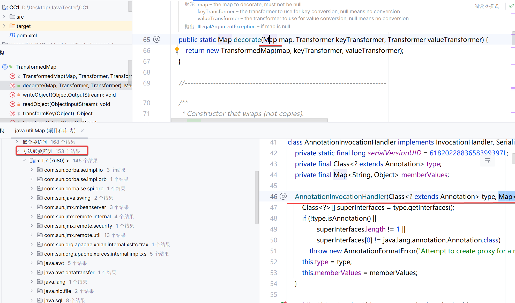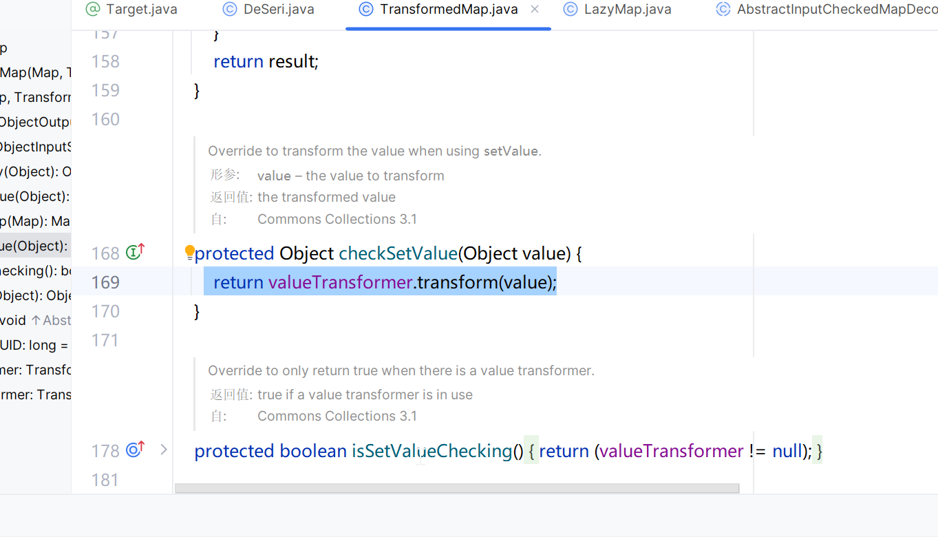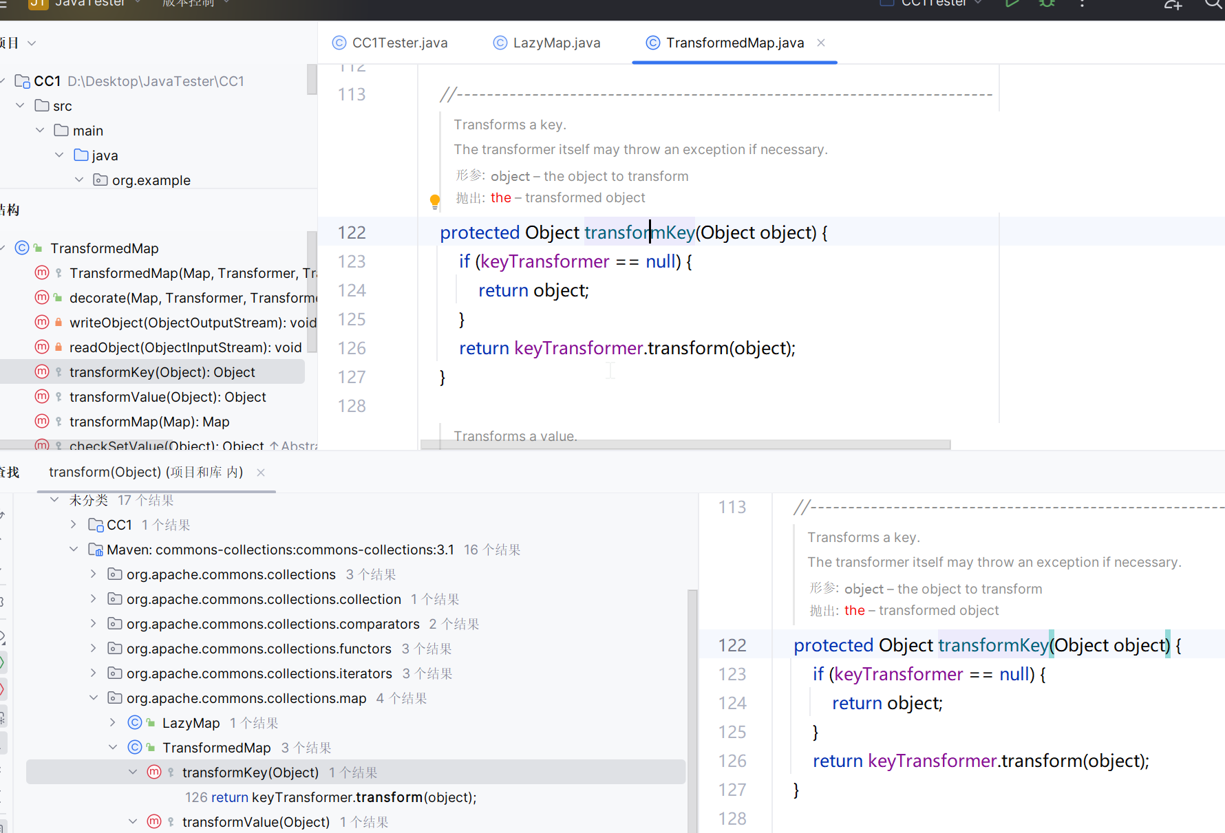 但是看上面的操作,发现会对Map对象使用get操作,这时候我们只要找到对get方法操作有调用transform函数的即可,这时候转到tranform用法,发现了LazyMap中有使用get函数调用transform函数
