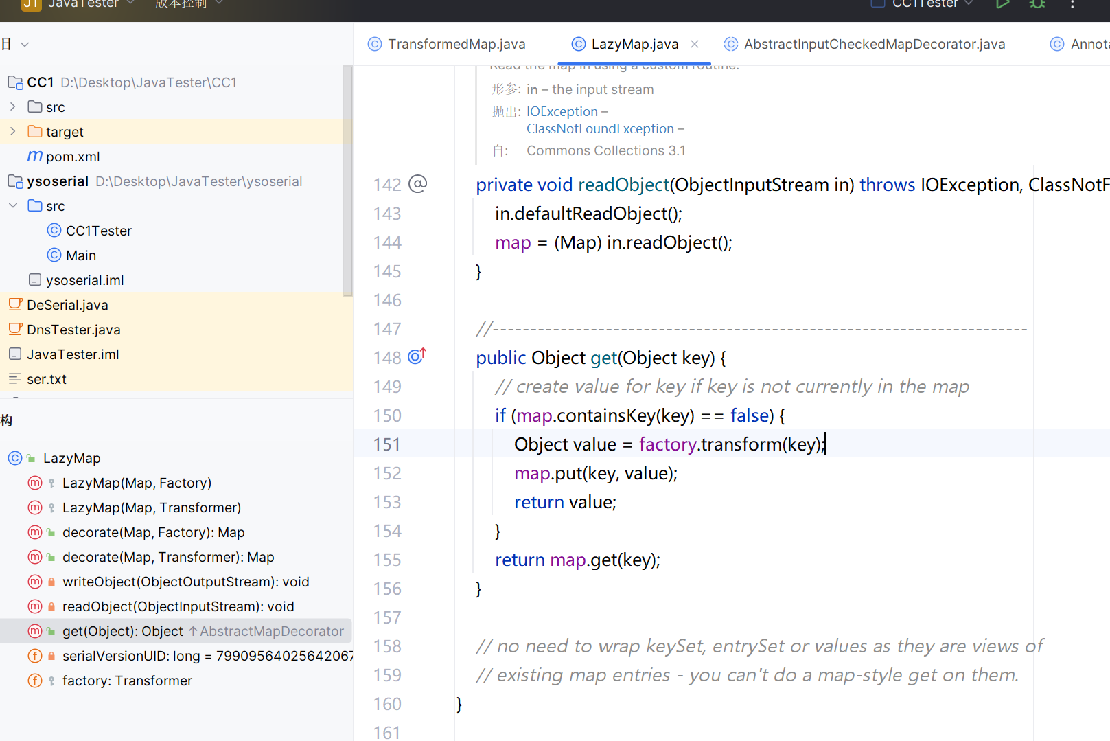 Lazymap链 上面用到TransformedMap是为了解决transform函数调用问题,Lazymap类也可以解决这个问题,而且ysoserial也是用的这个方法,下面就分析一下