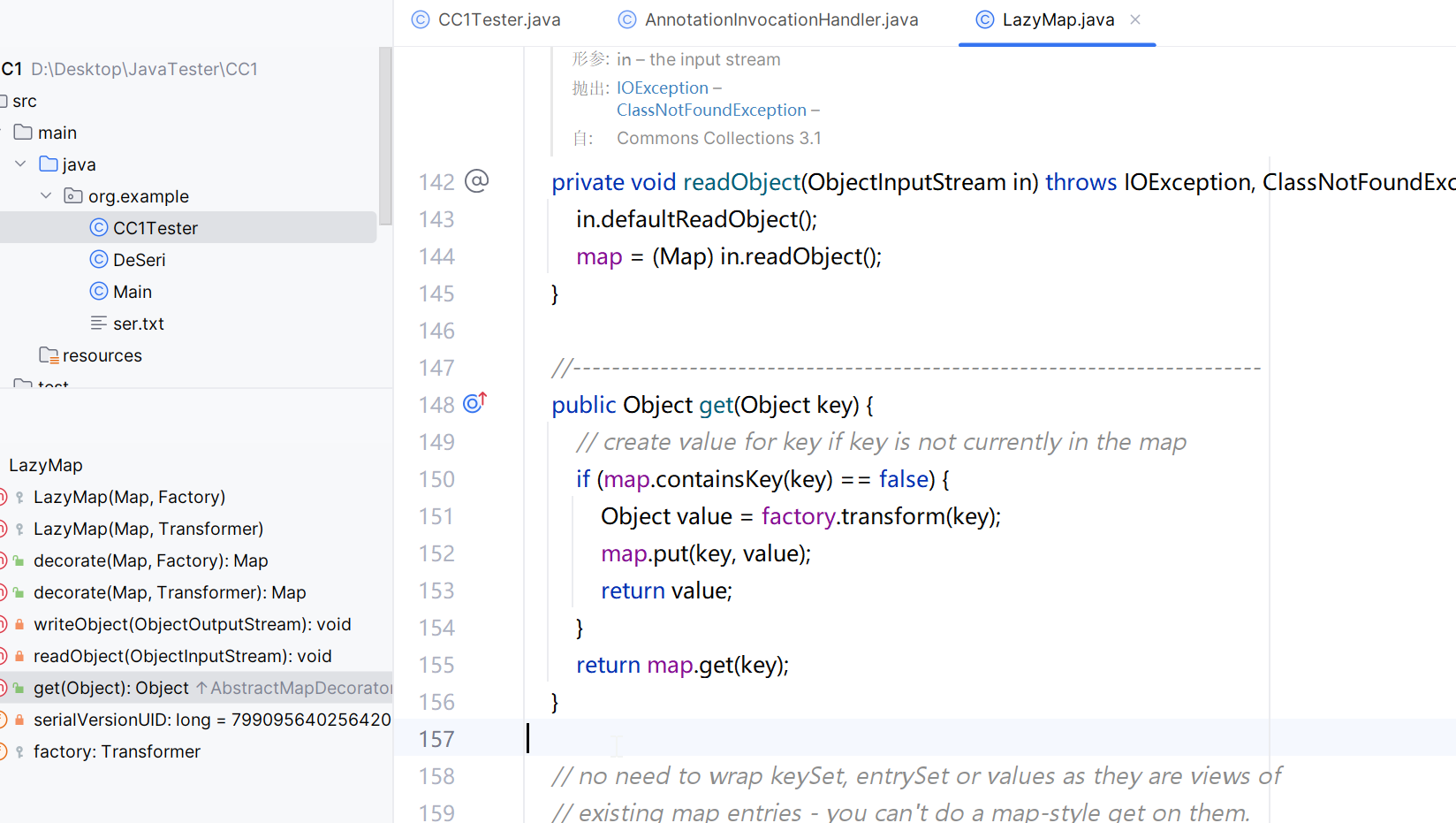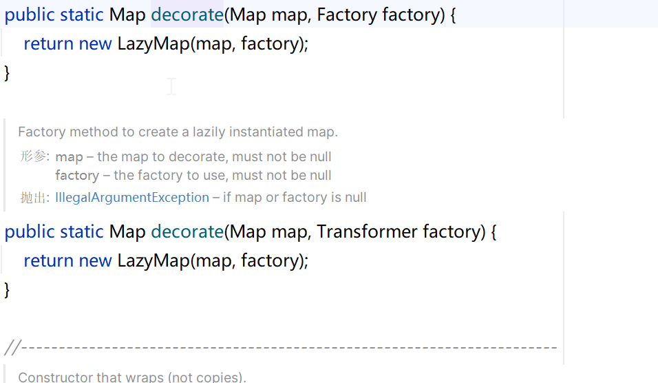 里面有一个decorate方法和TransformedMap类中的decorate方法一样也是帮助我们创建Lazymap对象的,所以按照参数创建即可,如此只要由readObject调用Map的get方法即可实现调用transform方法,即可执行我们的恶意命令
