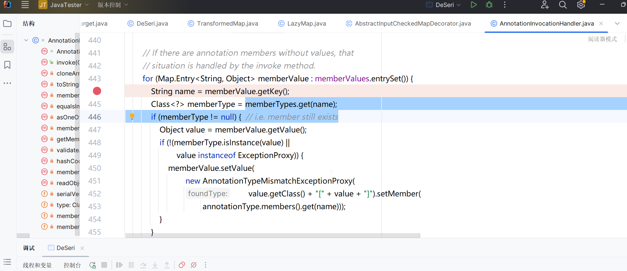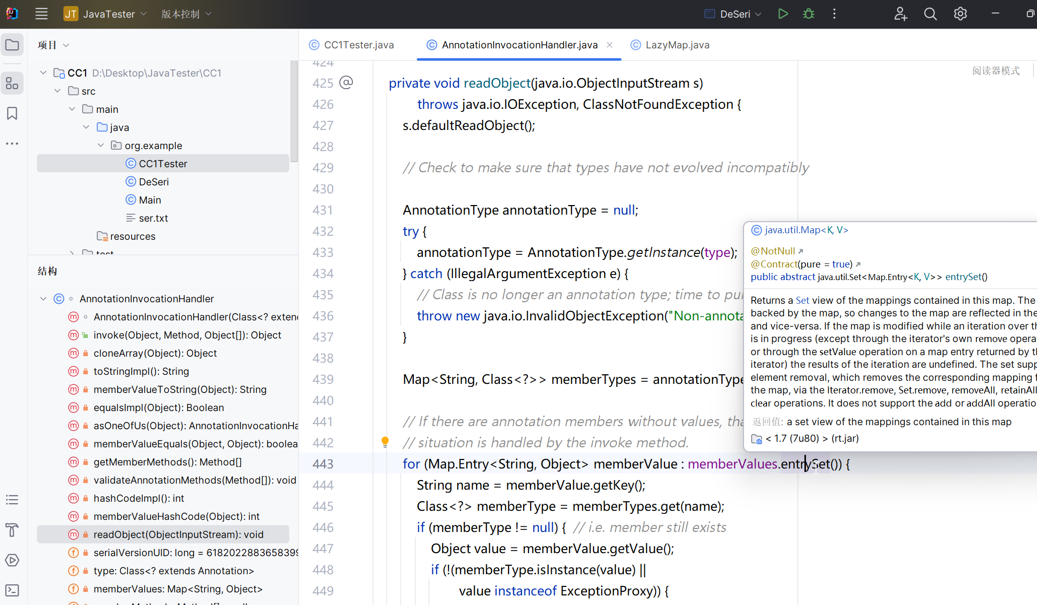 然后发现在readObject中调用了Map对象的entrySet方法 由此可以知道,只要AnnotationInvocationHandler建立Map的动态代理,然后将动态代理对象作为Map对象传入新的AnnotationInvocationHandler对象中,等到执行memberValues.entrySet()时就会先去AnnotationInvocationHandler中的involke中执行get方法,然后再回到LazyMap的get,就执行了transform