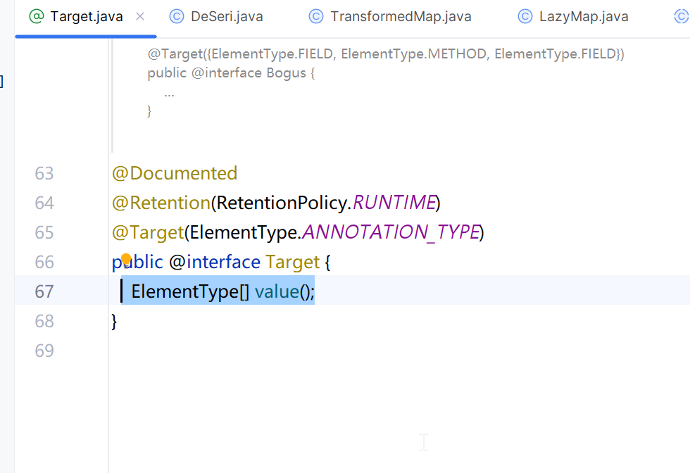 因为在AnnotationInvocationHandler中要先判根据键的类型是否是空 因为我们传入的是Target注解,可以看到里面只有value