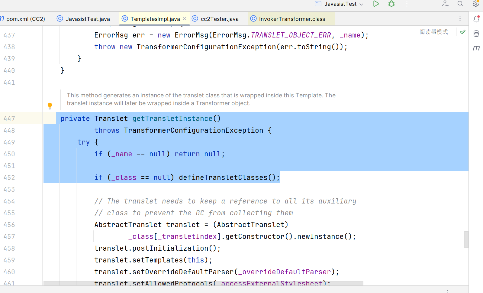 继续回到分析,上一步已经到了getTransletInstance(),并且条件我们已经顺利满足,继续执行下一个函数defineTransletClasses()