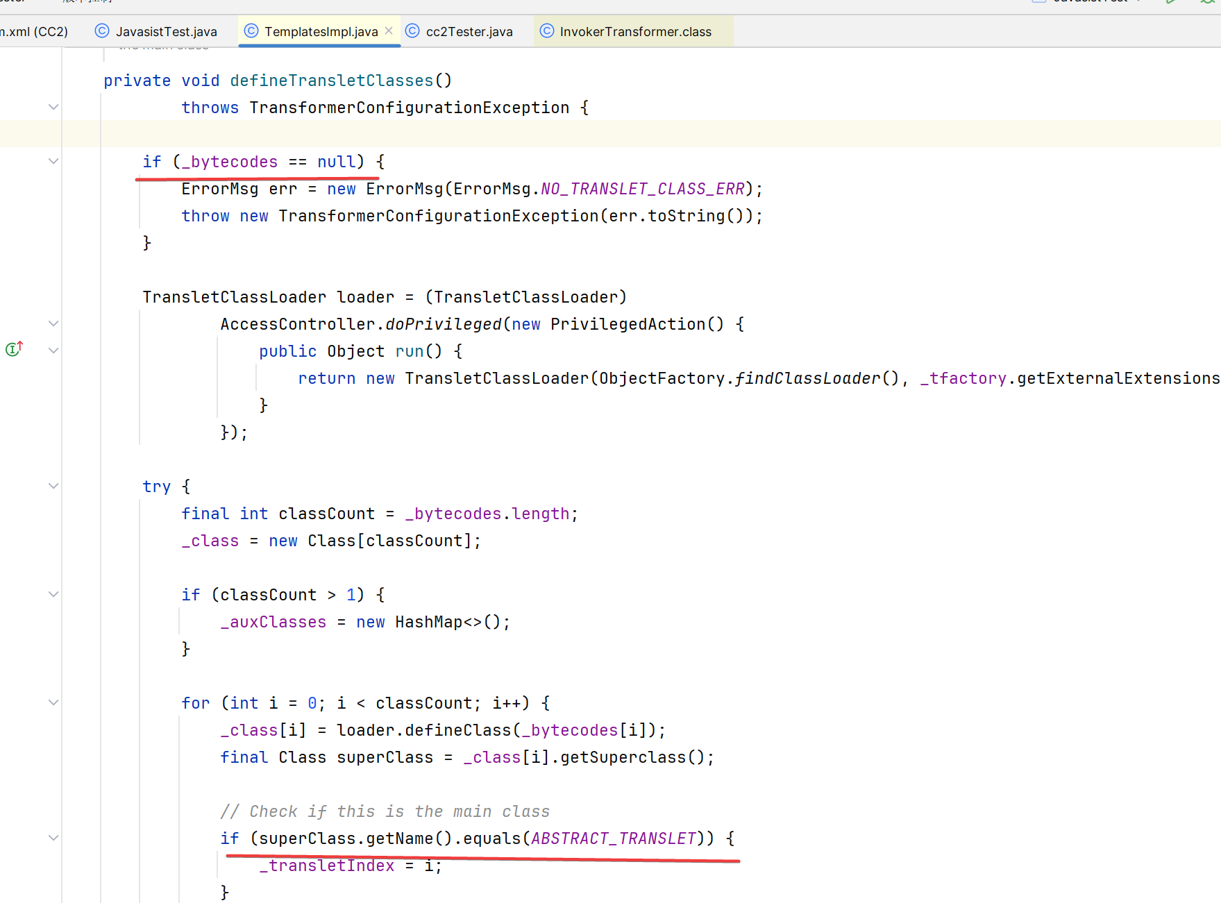 所以接下来需要分析怎么通过以上的链实现调用TemplatesImpl中的defineClass()方法
