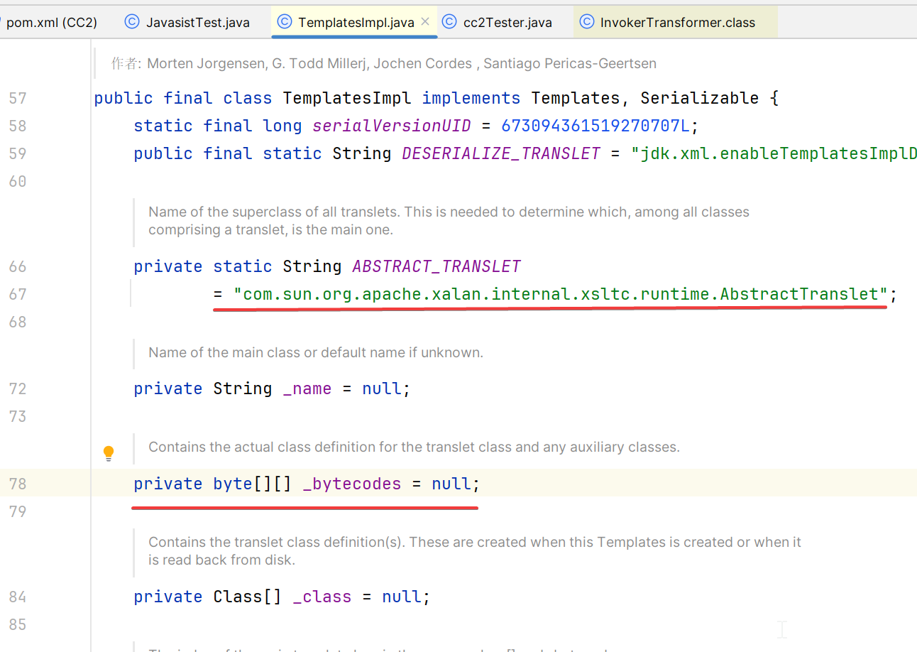 这些前置知识到这里就分析完了,我们最后要利用这个TemplatesImpl去加载我们生成的恶意字节码,但是我们还缺一个反序列化的入口,这个入口接下来将在cc2链中介绍