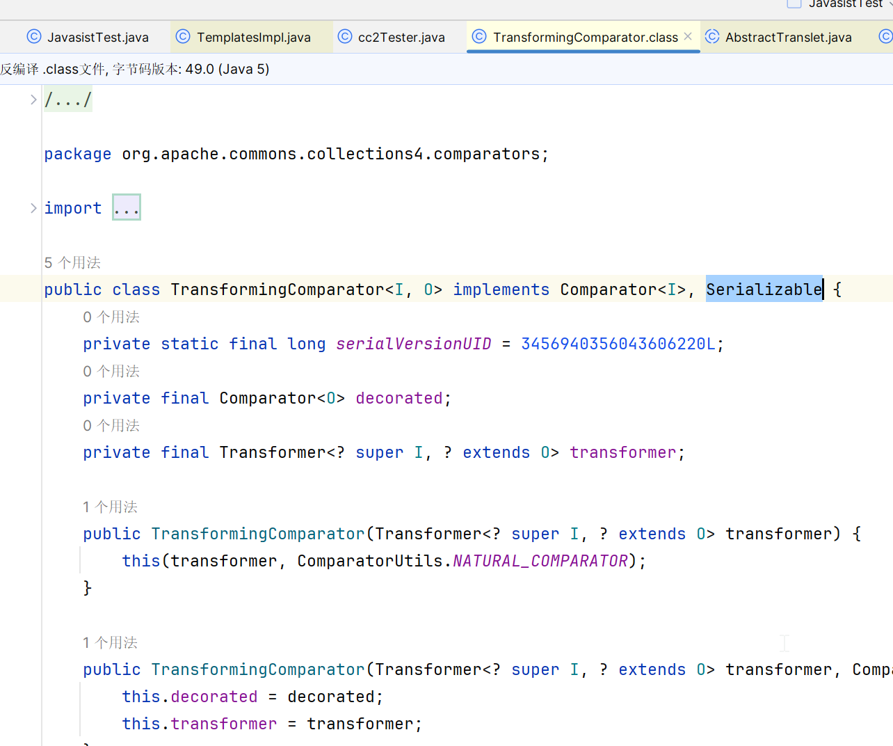 看了一下,AbstractTranslet是一个抽象类,只需要在利用javasist创建恶意字节代码时继承这个类就行了