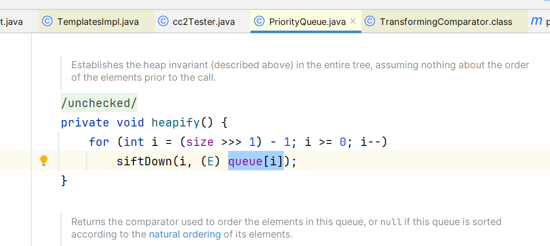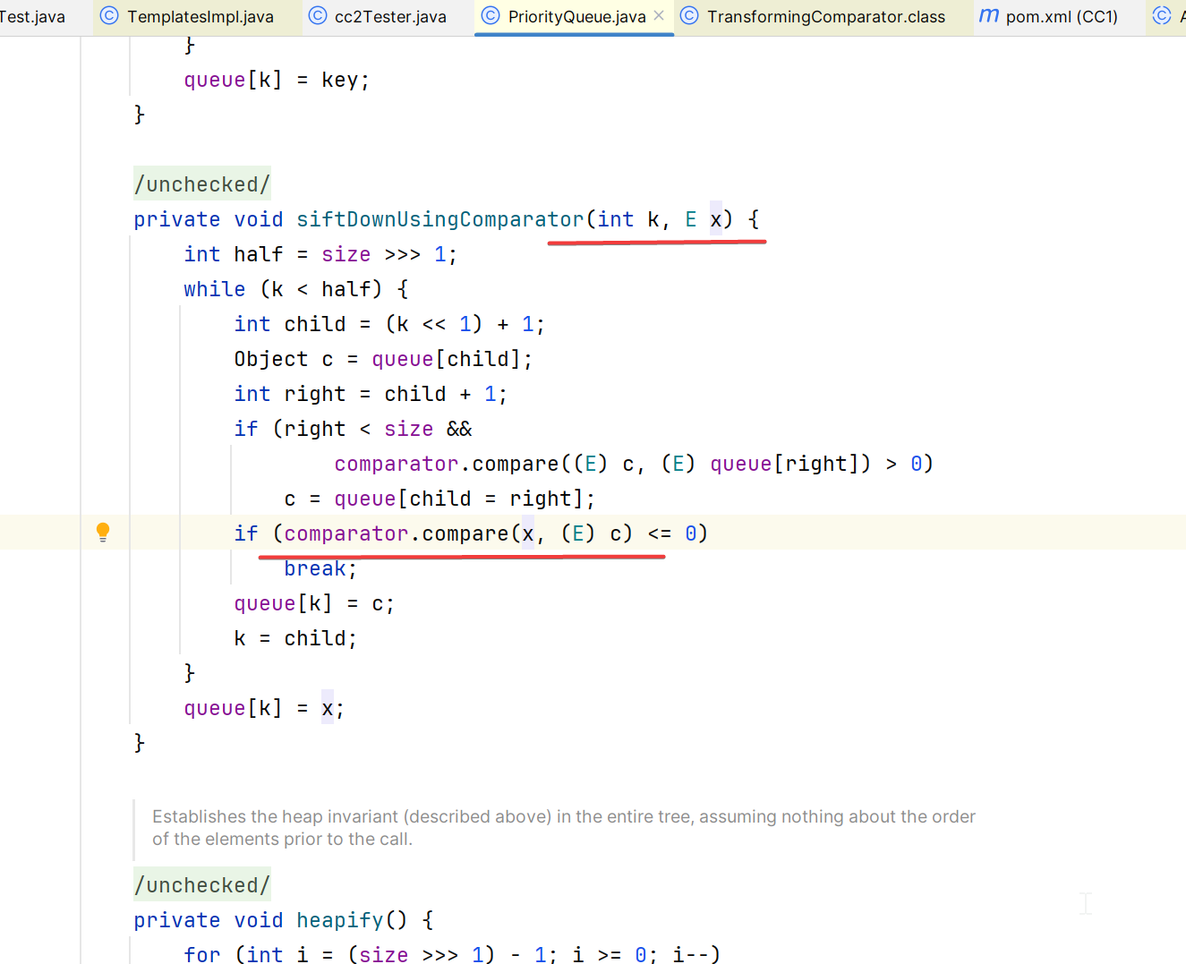 查找谁调用了siftDownUsingComparator()方法,发现是siftDown()方法,并且参数有x 它的逻辑是如果comparator不为null就调用这个函数,所以我们需要使用反射修改这个值为 TransformingComparator对象