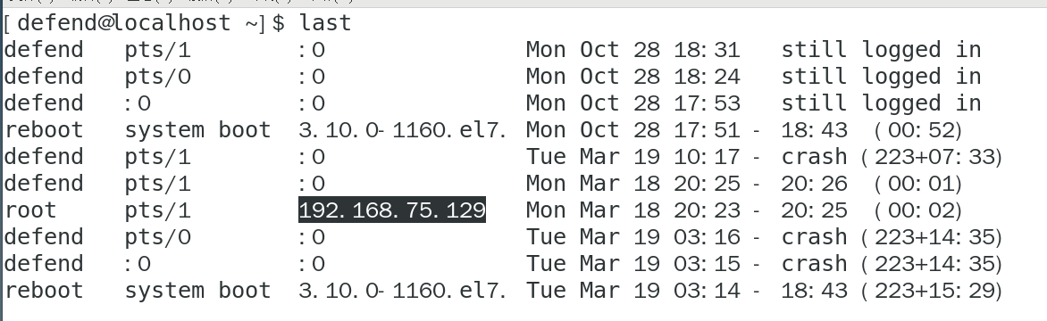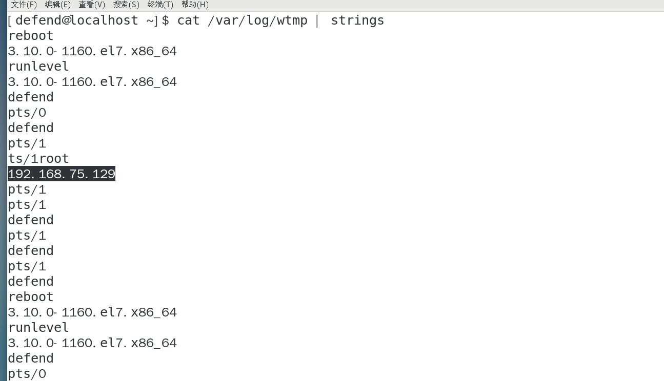 1 | 显示用户的最近的登录日志,实际上是查看的是wtmp日志,位于/var/log/wtmp文件 |