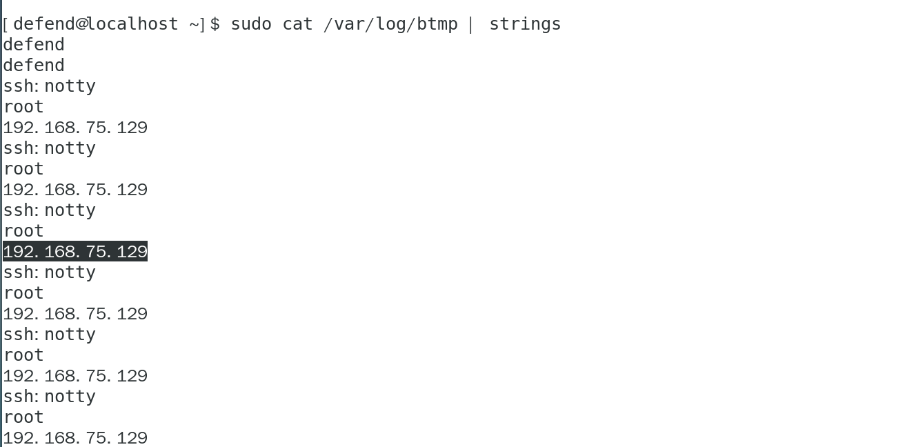 果然进行了很多次的ssh登录失败记录,这一步获得的IP地址也是192.168.75.129,大概率就是攻击者IP