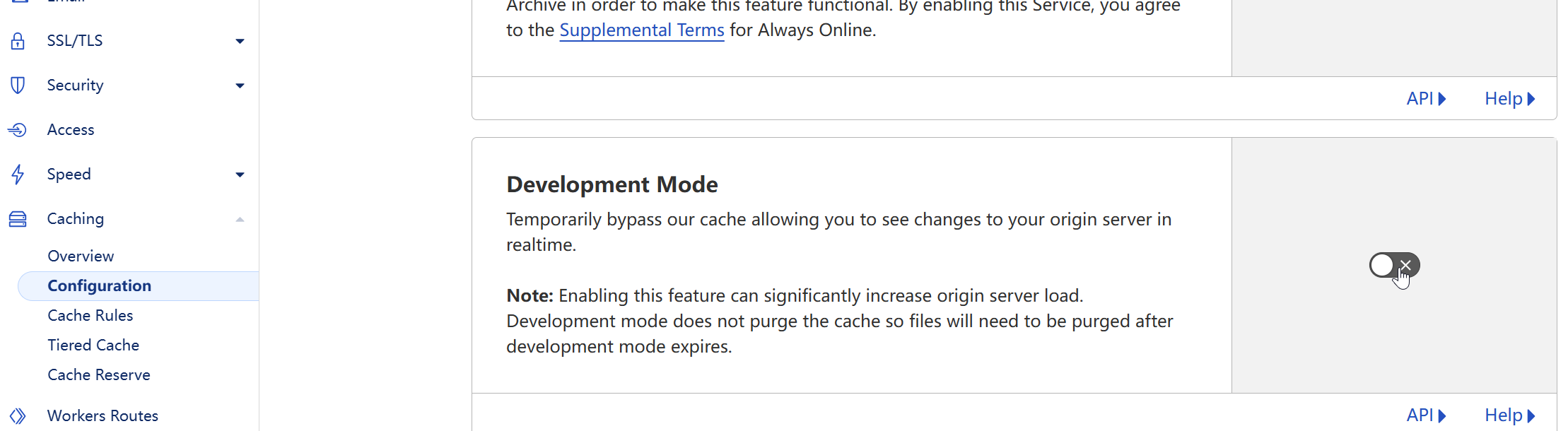 点击对应的域名,然后找到caching中的configuration,打开开发模式